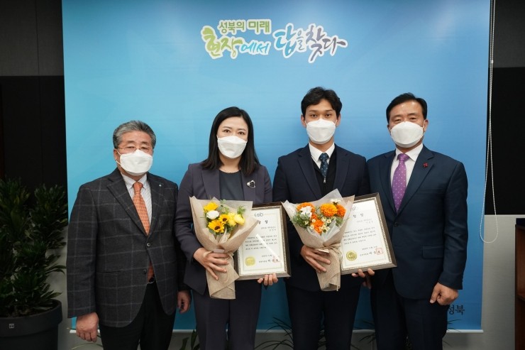 성북구(구청장 이승로)가 보이스피싱(전화금융사기)으로부터 주민 피해를 막은 장위2동 새마을금고 안선미 상무, 이용욱 대리에게 11일 표창을 수여했다. 안선미 상무와 이용욱 대리는 장위동 주민 어르신(85)이 본인 명의 정기예금을 중도해지를 요청하는 ...