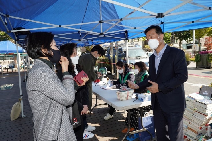 성북구(구청장 이승로)가 워킹스루 도서교환마당을 펼쳤다. 서울시 자치구 최초로 펼쳐지는 코로나19 맞춤형 도서 교환시장 풍경에 많은 이가 주목했다. 지난달 30일 성북구청 앞 바람마당에서 펼쳐진 워킹스루 도서교환마당은 성북구와 새마을문고중앙회 성북구지부(...