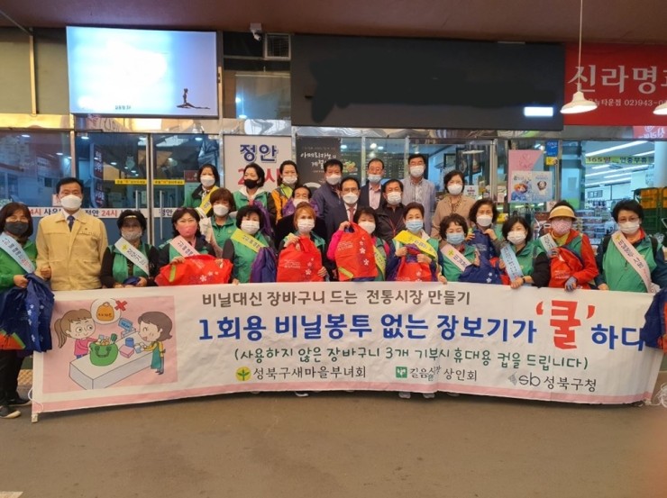 성북구 새마을부녀회(회장 조영남)는 길음시장 등 전통시장 일대에서 시민과 상인을 대상으로 1회용품 사용자제 및 장바구니 사용 권장 캠페인을 실시하고 있다. 캠페인은 사회적거리두기 실천 차원에서 각 동 주부대표 20여 명이 소규모로 참여하고 있으며 폐비...