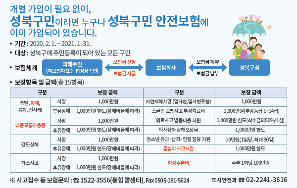 성북구(구청장 이승로)가 불의의 사고와 재난으로부터 피해를 본 구민을 보호하기 위해 '성북구민 안전보험' 제도를 시행하고 있다. 이 보험으로 성북구민은 일상생활 중 예기치 못한 사고를 당하면 보장 혜택을 받을 수 있게 되었다. 전국 어디서나 구민 안전을 ...