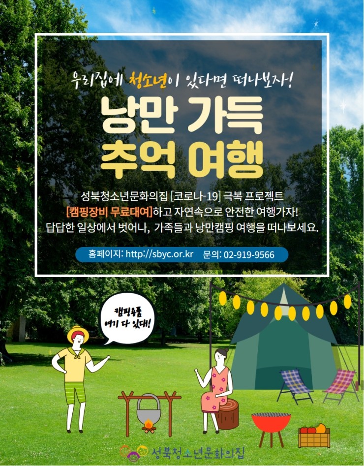 성북구(구청장 이승로)가 『코로나바이러스감염증-19』로 인해 급감한 외부활동을 장려하고 위축된 청소년 활동을 지원하기 위해 청소년과 가족을 대상으로 캠핑 장비 무료 대여 사업을 운영한다. 최근 『코로나바이러스-19』로 인해 변화된 일상생활에서 밀폐된 실내 활동...