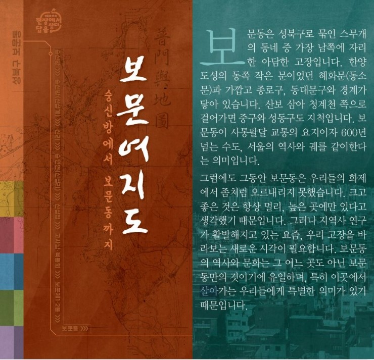 성북구(구청장 이승로) 보문동은 과거부터 현재까지 지역의 변천과정을 이야기로 풀어낸 스토리텔링 북 ‘보문여지도’를 발간하였다고 한다. 이 책자는 보문동 지역이 ‘숭신방’이란 행정구역으로 등장한 조선시대부터 현재의 성북구 보문동으로 바뀌기까지 지리적 정보를 기...
