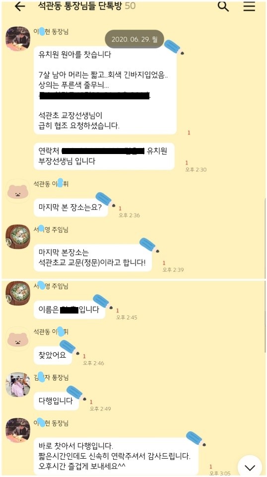 성북구(구청장 이승로) 석관동에서 동주민센터 및 주민들이 실시간으로 현장소통방(단체카톡방)을 통해 실종된 어린이를 15분 만에 무사히 발견하는 미담사례가 연일 화제다. 6월 29일 오후 2시 30분경 석관동주민센터(동장 이대현)는 석관초등학교로부터 7세 ...