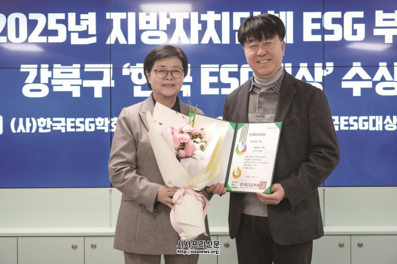 강북구, '제3회 한국 ESG 대상' 지방자치단체 ESG 부문 '대상' 수상 자연 회복부터 지역경제·주민 건강까지 포괄한 정책 중점 추진 ▲이순희 강북구청장(왼쪽)과 윤보영 부구청장(오른쪽)이 ‘제3회 한국 ESG 대상’ 지방자치단체 ESG 부문 ‘대상’ 수상...