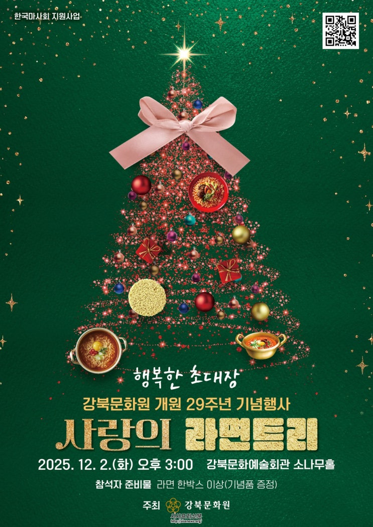 강북문화원, 개원 29주년 기념 ‘사랑의 라면트리’ 어려운 이웃과 함께하는 따듯한 나눔 행사 (시사프리신문=유영일 기자) 강북문화원(원장 황정희)은 오는 12월 2일(화) 오후 3시, 강북문화예술회관 강북소나무홀에서 개원 29주년을...
