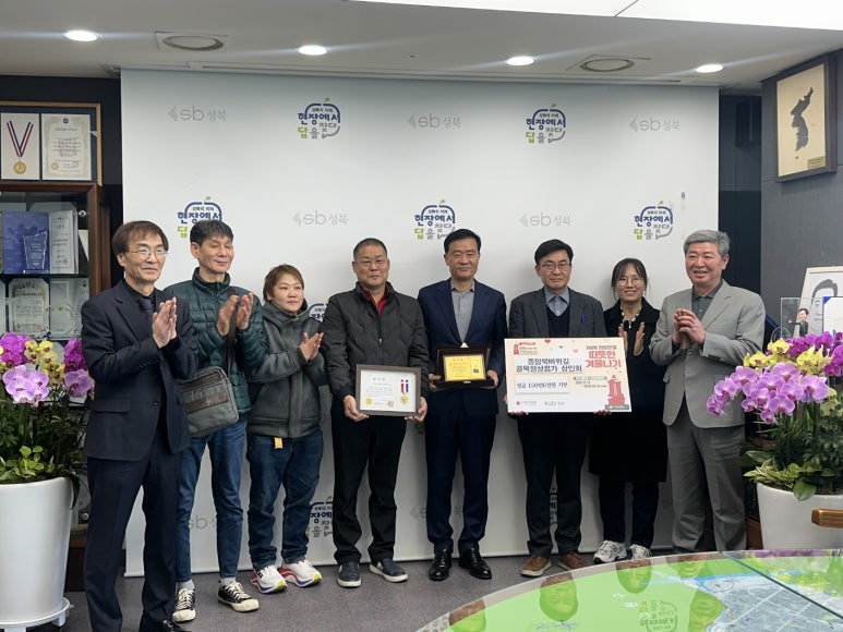 종암동 북바위길 상인회, 이승로 구청장에게 감사패 전달 골목상권 최초 불우이웃돕기 성금 1백 50만 6천 원 기탁, 훈훈한 온정 나눠 ▲종암동 북바위길 상인회, 이승로 구청장에게 감사패 전달 기념사진 (시사프리신문=김영국 기자) 종암북바위길 상...