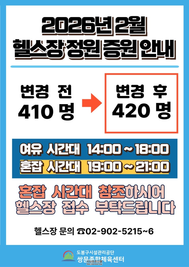 쌍문종합체육센터, 헬스장 정원 확대 쌍문종합체육센터, 이용 수요 증가 반영해 2026년 2월부터 10명 확대 운영 도봉구시설관리공단(이사장 김기수)은 쌍문종합체육센터 헬스장 이용 수요 증가에 따라 2026년 2월 수강분부터 헬스장 정원을 기존 410명에서...