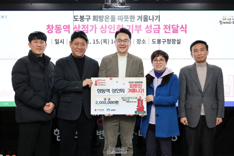 도봉구, 창동역상점가 상인회로부터 성금 전달받아 도봉구, 창동역상점가 상인회 성금 전달 기념사진 도봉구(구청장 오언석)가 지난 1월 15일 창동역상점가 상인회(회장 손창래·장준영)로부터 성금 200만 원을 전달받았다고 밝혔다. 전달받은 성금은 서울사회복지공...