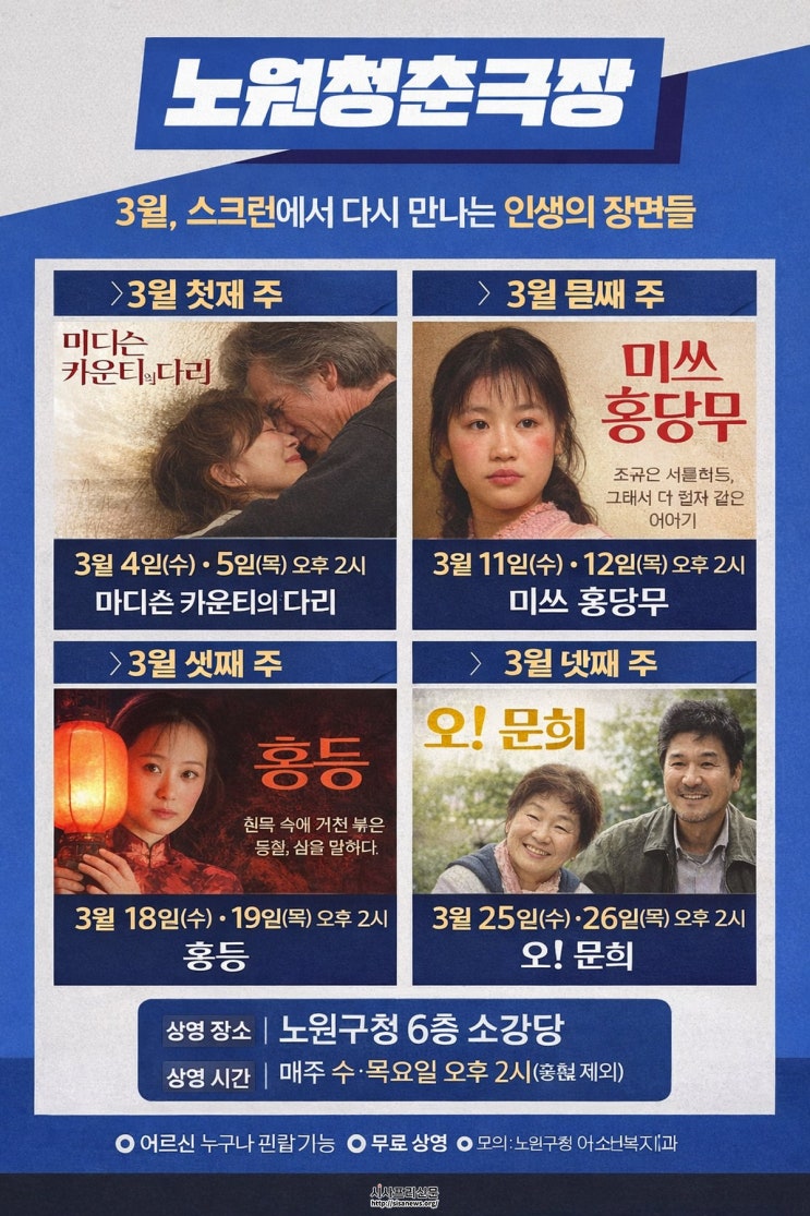 노원청춘극장, 3월에도 추억과 공감의 영화 이어간다” 영화로 만나는 추억과 공감의 시간…매주 수·목 오후 2시에 만나요 (시사프리신문=정진만 기자) 노원구가 운영하는 노원청춘극장이 3월에도 어르신들을 위한 영화 상영을 이어간다. ...