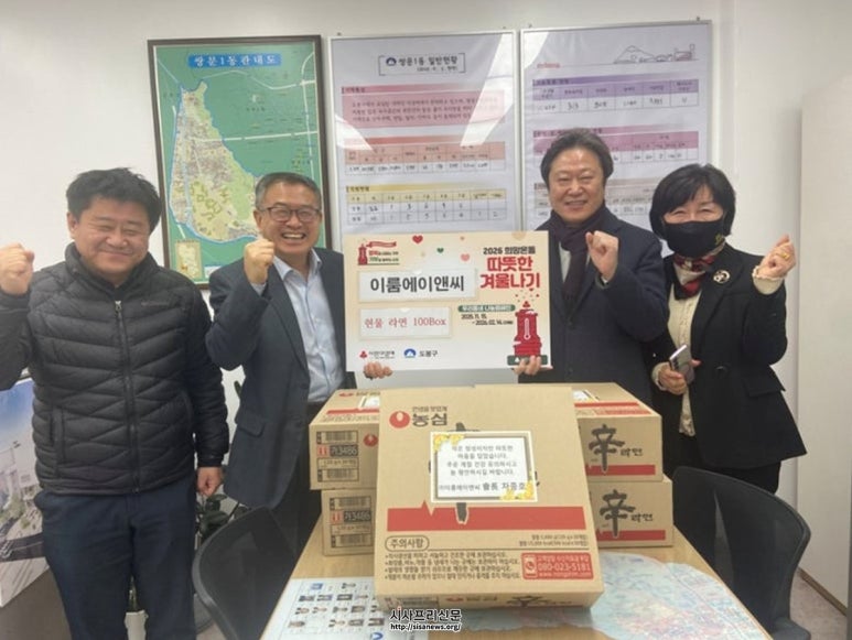 쌍문1동, ㈜이룸에이앤씨로부터 라면 100박스 전달받아 ▲쌍문1동은 지난해 12월 17일 ㈜이룸에이앤씨(회장 차종호)로부터 라면 100박스를 전달받았다. 도봉구(구청장 오언석) 쌍문1동은 지난 12월 17일 ㈜이룸에이앤씨(회장 차종호)로부터 라면 100박스(225만...