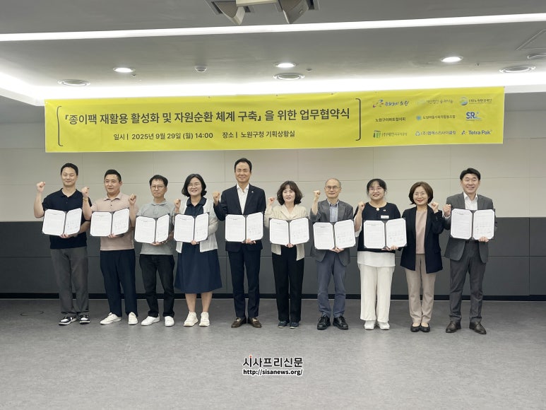 노원구, 8개 기관과 종이팩 자원순환 체계 구축 위한 업무협약 (시사프리신문=정진만 기자) 노원구(구청장 오승록)가 생활 속 탄소중립 실현을 위해 발 벗고 나섰다. 구는 지난 9월 29일 오후 구청 회의실에서 (재)숲과나눔, 노원환경재...