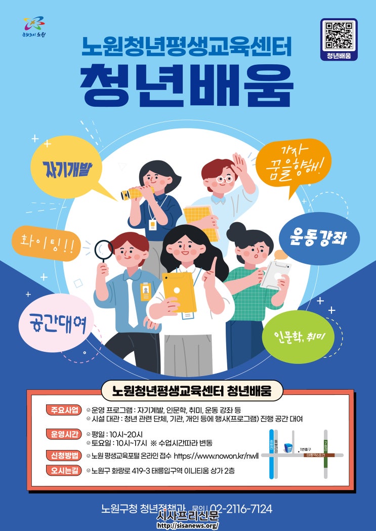 노원구, 청년 평생학습센터 ‘청년 배움’ 개소 청년이 머무는 노원, 배움으로 성장하는 청년! (시사프리신문=정진만 기자) 노원구(구청장 오승록)가 청년들을 위한 평생학습센터 ‘청년 배움’을 10월 1일 정식 개소했다고 밝혔다. 이 센...