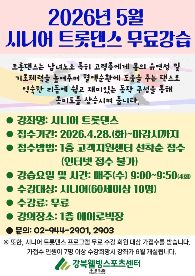 강북웰빙스포츠센터, 시니어 트롯댄스 무료 강습 운영 고령층 건강·여가 수요 반영… 5월 한 달간 무료 체험 강습 운영 강북구(구청장 이순희) 대표 체육시설인 강북웰빙스포츠센터는 지역사회 고령화에 대응하고 생활체육 프로그램을 다양화하기 위해 ‘시니어 트롯댄...