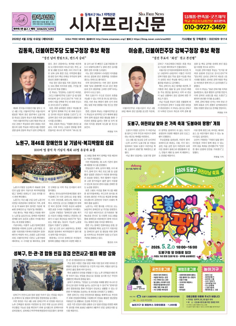 성북구 ‘장애인 어울림 한마당’ 개최 제46회 장애인의 날 기념… 공연·표창·체험 어우러진 화합의 장 (시사프리신문=정진만 기자) 성북구에서 장애인과 비장애인이 함께 어우러지는 봄맞이 축제가 열린다. (사)성북구장애인단체연합회는 오는 ...