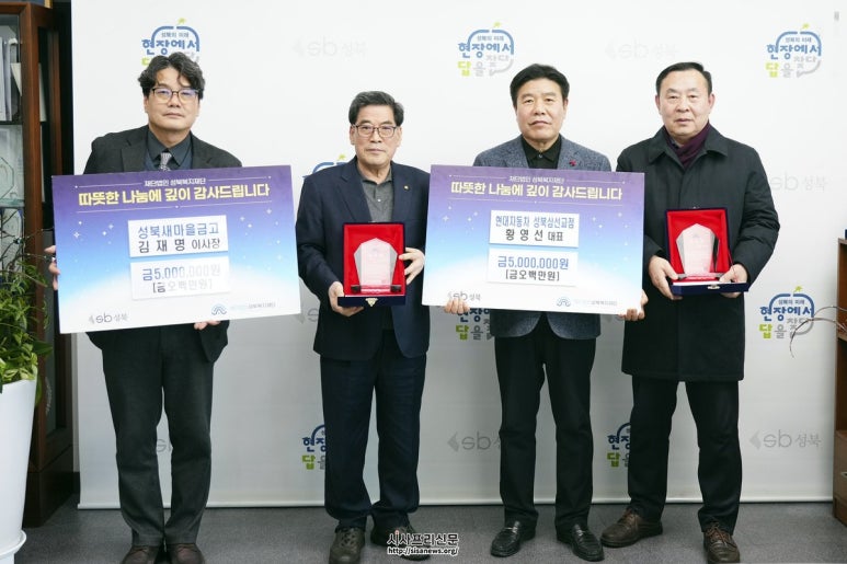 지역사회에서 성장한 기관, 성북복지재단에 기부금 전달 성북동새마을금고(이사장 김재명), 현대자동차 성북삼선교점(대표 황영선) 각각 500만 원씩 총 1,000만 원 지정기탁금 성북복지재단에 전달 지역사회에서 성장한 기관, 성북복지재단에 기부금 전달 재단법인...