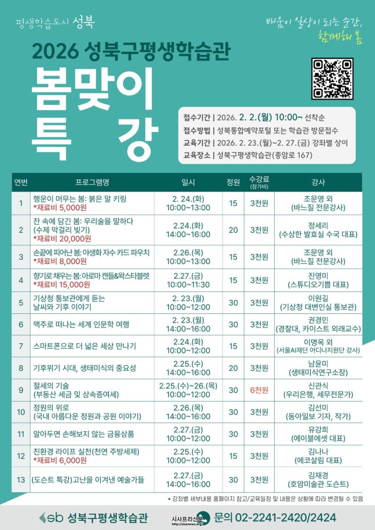 성북구, ‘2026 평생학습관 봄맞이 특강’ 운영 문화예술·인문교양·생활경제 아우른 분야별 강좌 구성 환경·인권 주제 시민교육 포함한 사회적 가치 중심 프로그램 성북구(구청장 이승로)가 구민의 평생학습 참여를 확대하고 일상 속 평생학습 문화를 확산...