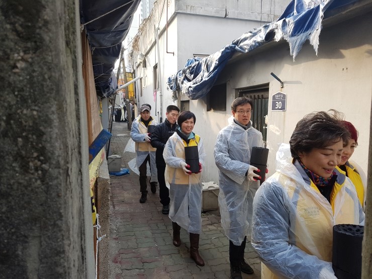 성북구(구청장 김영배) 길음1동에서는 지난 7일(토)에 미아초등학교 동문회(회장 양승열) 30여명의 회원들이 길음역세권 재개발 지역에 거주하는 연탄 사용 저소득 5가구에 연탄 1,000장을 전달해 이웃사랑을 실천했다.