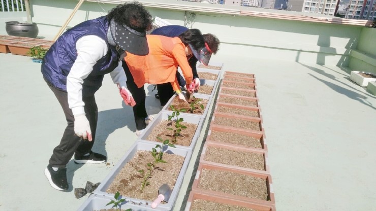 ▲정릉1동주민센터 옥상 ‘사랑나눔 마을텃밭’에서 모종을 식재하고 있는 녹색환경실천단원들