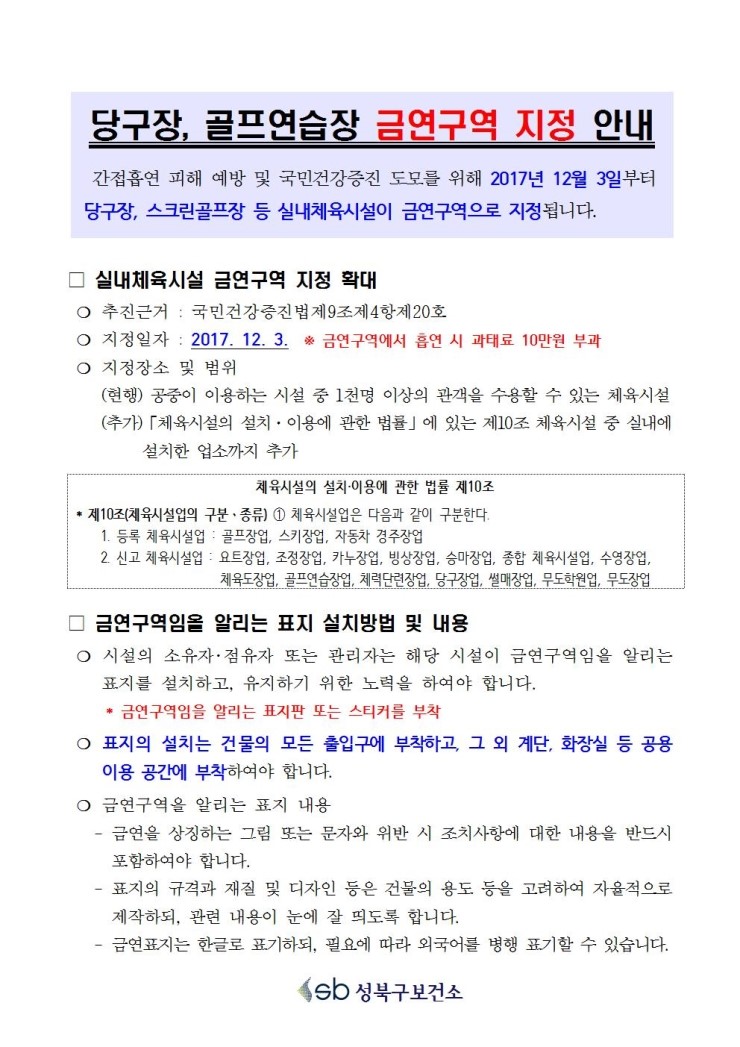 이에 서울 성북구(구청장 김영배)는 지난 9월부터 관내 소재한 당구장, 골프연습장 등 실내체육시설 203개소를 전수 방문하여 새롭게 지정되는 금연구역 안내 및 관리에 대해 집중지도와 홍보를 병행 실시했다.