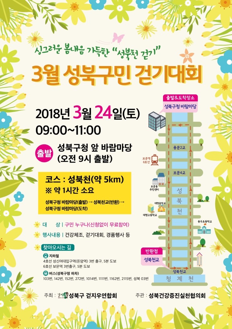 이번 3월 걷기대회는 성북건강증진실천협의회가 주관, ‘싱그러운 봄내음 가득한 성북천 걷기’의 부제로 열려 성북천의 봄기운과 함께 가족, 친구와 심신을 정화할 수 있는 시간이 될 것으로 보인다.