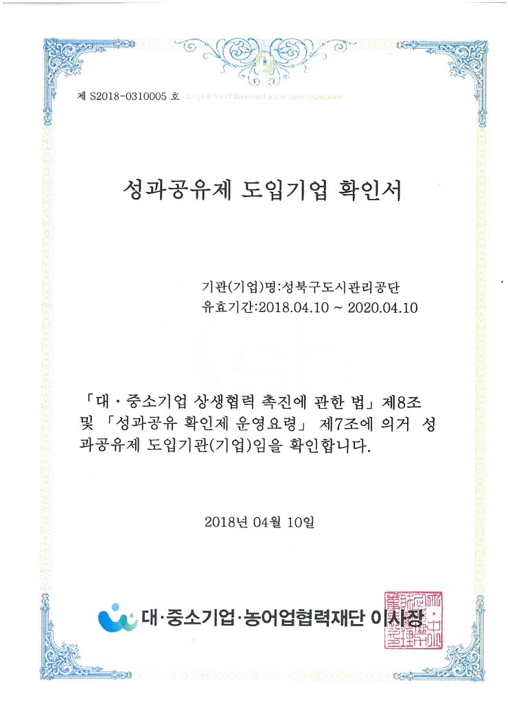 성북구도시관리공단(이사장 권혁소)은 지난 10일 전국 지방공단 최초 “성과공유제 도입기업” 확인을 받았다.