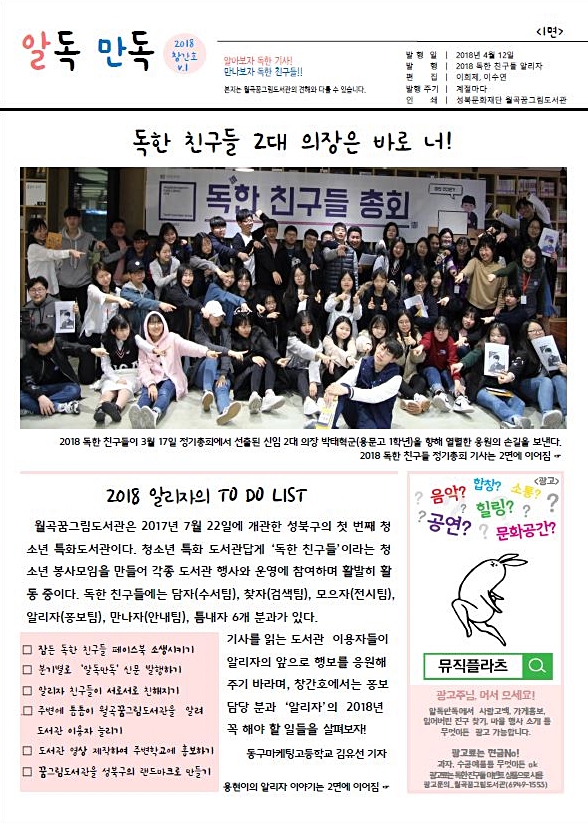 청소년 특화도서관 ‘월곡 꿈그림 도서관’의 독(讀)한 친구들이 4월 12일 청소년 신문 계간 『알독만독』을 창간했다.