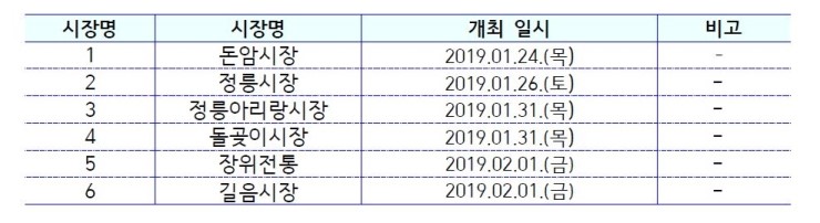 설 명절 행사는 오전 11시부터 오후 6시까지 1월 24일 돈암시장을 시작으로 정릉시장(1/26), 정릉아리랑시장(1/31), 돌곶이시장(1/31) 장위전통시장(2/1), 길음시장(2/1)에서 오전 11시부터 오후 6시까지 진행된다.