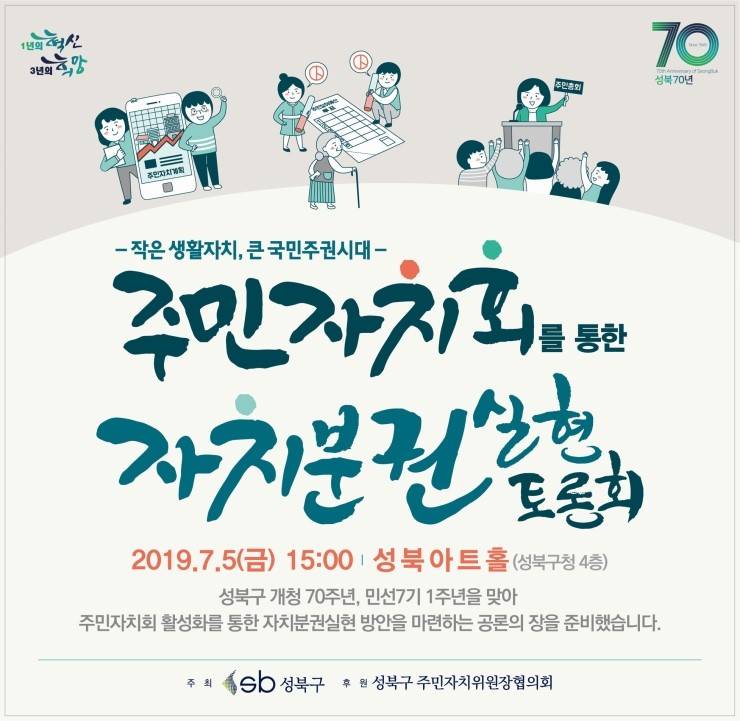 성북구(구청장 이승로)가 ‘작은 생활자치, 큰 국민주권시대’라는 부제로 “주민자치회를 통한 자치분권실현 토론회”를 7월 5일 오후 3시에 성북구청 성북아트홀에서 개최한다.