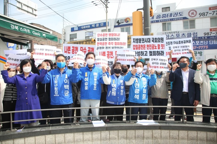 더불어민주당 비상대책위원회에서는 지난 22일 오전 강북구청장 후보로 최선 예비후보자를 발표했고 23일 오전 10시 김기옥·이백균·이순희·이승훈·안광석 예비후보는 박용진 국회의원(강북을) 사무실 앞에서 기자회견을 열고 최선 예비후보의 전략공천 철회를 주장했다.