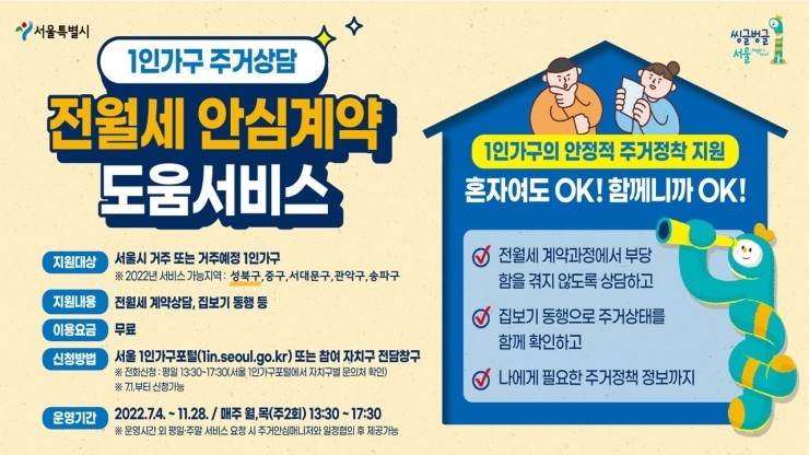 성북구(구청장 이승로)가 1인가구의 안정적인 주거정착과 주택임대차 분야 안심계약을 지원하기 위해 1인가구 전·월세 안심계약 도움서비스인 『함께 찾아볼까요? 구해줘! 싱글홈』을 7월 4일부터 시작한다.