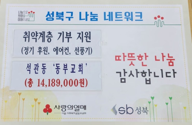 지난 5일 석관동에 위치한 동부교회(목사 유창걸)에서 관내 취약계층을 위해 기부금 정기 후원을 약속하고 폭염 대비 냉방용품을 지원했다.