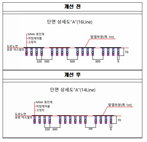 아울러 예산 절감을 위해 열선 설치 방법도 개선했다. 2차선 이면도로 등 폭이 좁고 중앙선 분리가 어려운 구간엔 평균 16줄의 열선이 설치되는데 이를 14줄로 줄이는 방식이다.