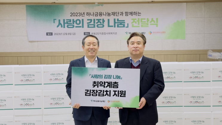 번동2단지종합사회복지관(관장 박성배)에서 한국사회복지관협회(회장 정성기)와 하나금융나눔재단(이사장 김한조)과 함께 서울지역에 거주하는 저소득 및 소외계층 2,541세대를 대상으로 ‘사랑의 김장 나눔 행사’를 진행하였다.