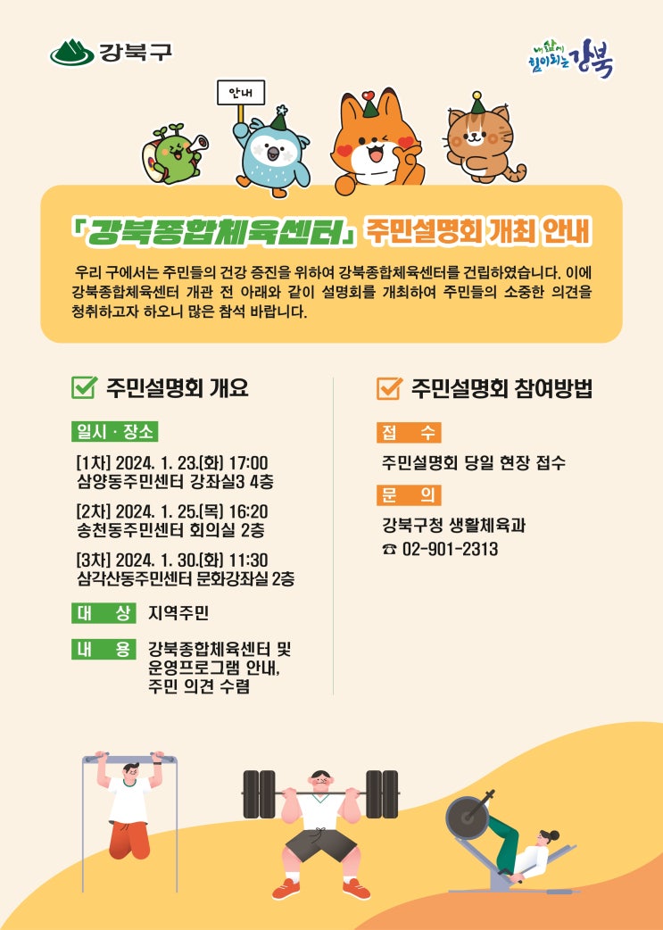 강북구(구청장 이순희)가 강북종합체육센터를 개관 전, 시설 운영에 대한 정보를 공유하고 주민들의 의견을 수렴하기 위해 오는 23일 삼양동주민센터를 시작으로 ‘찾아가는 주민설명회’를 3회 개최한다.