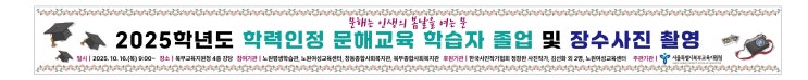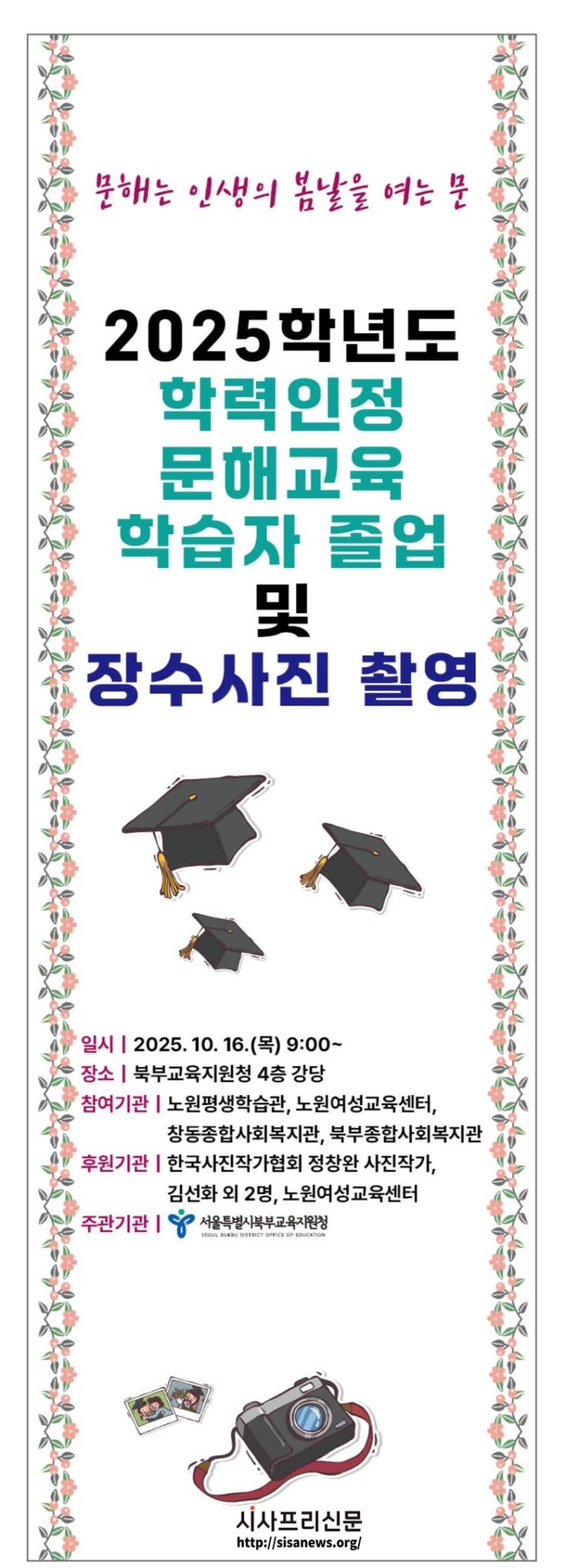 (시사프리신문=유영일 기자) 북부교육지원청(교육장 김태식)은 오는 10월 16일(목) 북부교육지원청 4층 강당에서 관내 문해 교육 기관 (노원여성교육센터, 노원평생학습관, 창동종합사회복지관, 북부종합사회복지관) 졸업 예정 학습자들을 대상으로 2025학년도 학력인정 문해교육 졸업 및 장수 사진 촬영 행사를 진행한다.