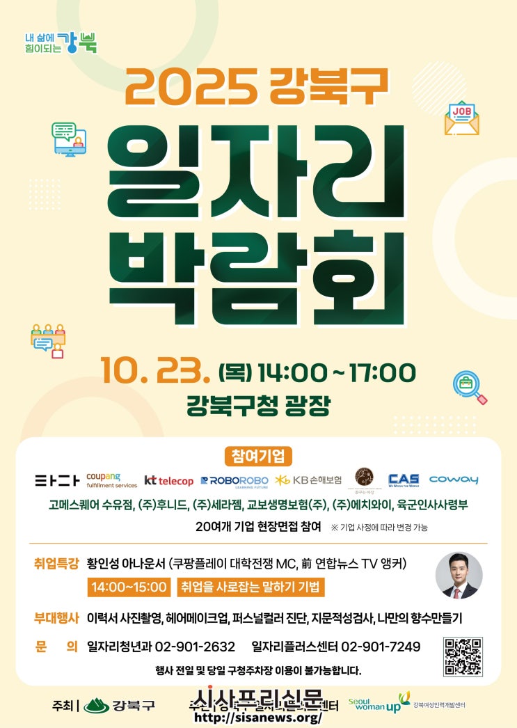 특히 같은 날 오후 2시 강북구청 4층 대강당에서 진행될 취업특강에서는 쿠팡플레이 「대학전쟁」 프로그램 진행자로 잘 알려진 황인성 아나운서가 연사로 나서 ‘취업을 사로잡는 말하기 기법’을 주제로 실전 노하우를 전한다.