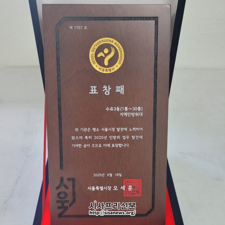 강북구(구청장 이순희) 수유3동 지역 민방위대가 서울특별시가 주관한 2025년 서울시 민방위대 정기검열에서 최우수 단체로 선정되어 지난 9월 18일 서울특별시장 표창을 수상했다.