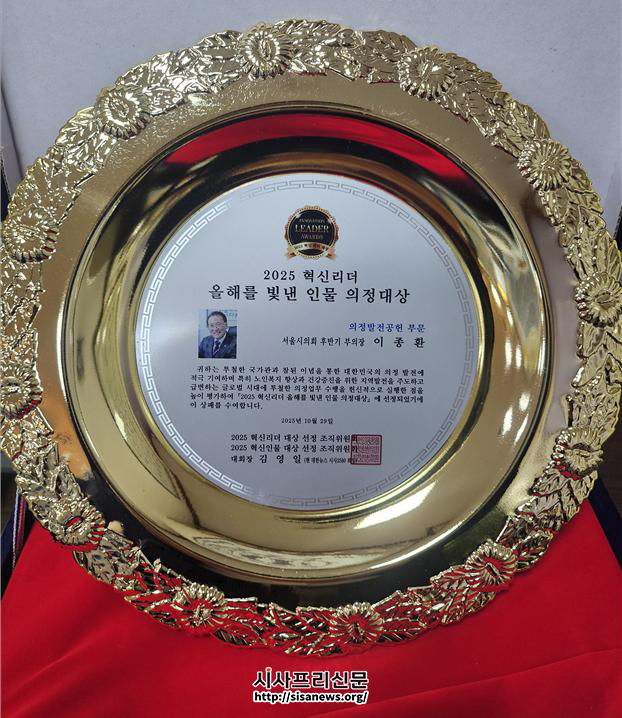 (시사프리신문=유영일 기자) 서울시의회 이종환 부의장(국민의 힘, 강북1)은 지난 10월 29일, 한 언론사가 개최한 혁신리더 대상 선정위원회가 선정한 ‘2025 혁신리더 올해를 빛낸 인물’ 시상식에서 의정발전공헌 부문 의정 대상을 수상했다.