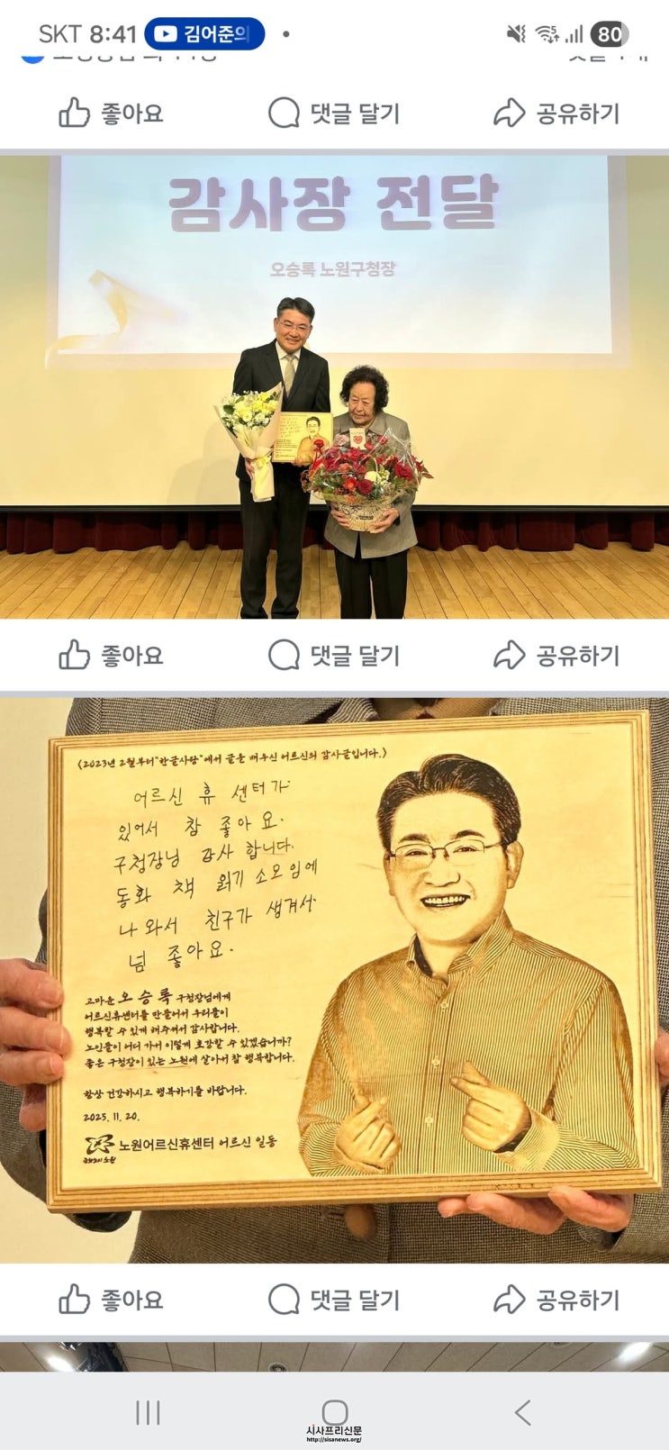 가장 큰 감동은 감사패 전달식에서 나왔다. 참석자 중 최고령인 97세 차봉화 어르신이 직접 오승록 구청장에게 감사패를 전달하는 순간, 행사장은 조용히 숨을 고르는 듯했다.