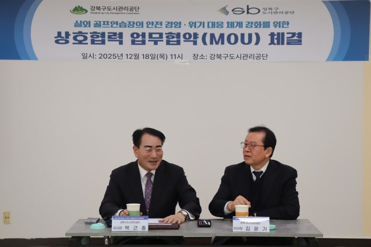 성북구도시관리공단(이사장 박근종)은 지난 12월 18일 강북구도시관리공단(이사장 김윤기)와 서울 강북구 수유동에 위치한 강북구도시관리공단 회의실에서 실외골프연습장 시설안전 강화를 위한 업무협약(MOU)을 체결했다고 밝혔다.