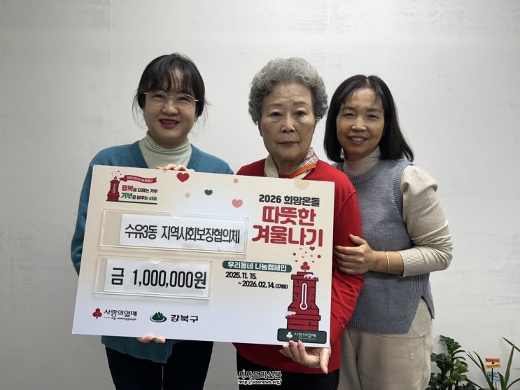 수유3동 주민자치회는 지난해 12월 22일 김치 150kg과 성금 40만 원을 전달했으며, 지역사회보장협의체는 12월 26일 복지 사각지대 해소를 위해 성금 100만 원을 기탁해 나눔 문화 확산에 앞장섰다.