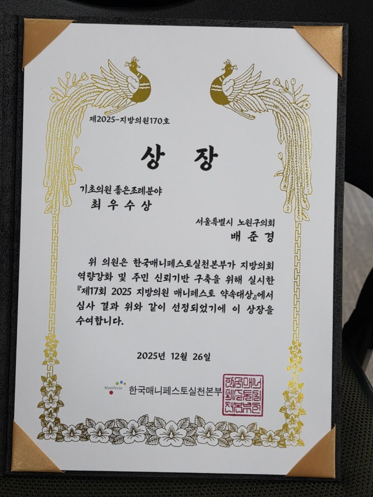 (시사프리신문=정진만 기자) 노원구의회 배준경 의원(국민의힘, 월계1·2·3동)이 지난 26일 한국매니페스토실천본부가 주최한 ‘2025 지방의원 매니페스토 약속대상’에서 좋은조례 분야 최우수상을 수상했다.