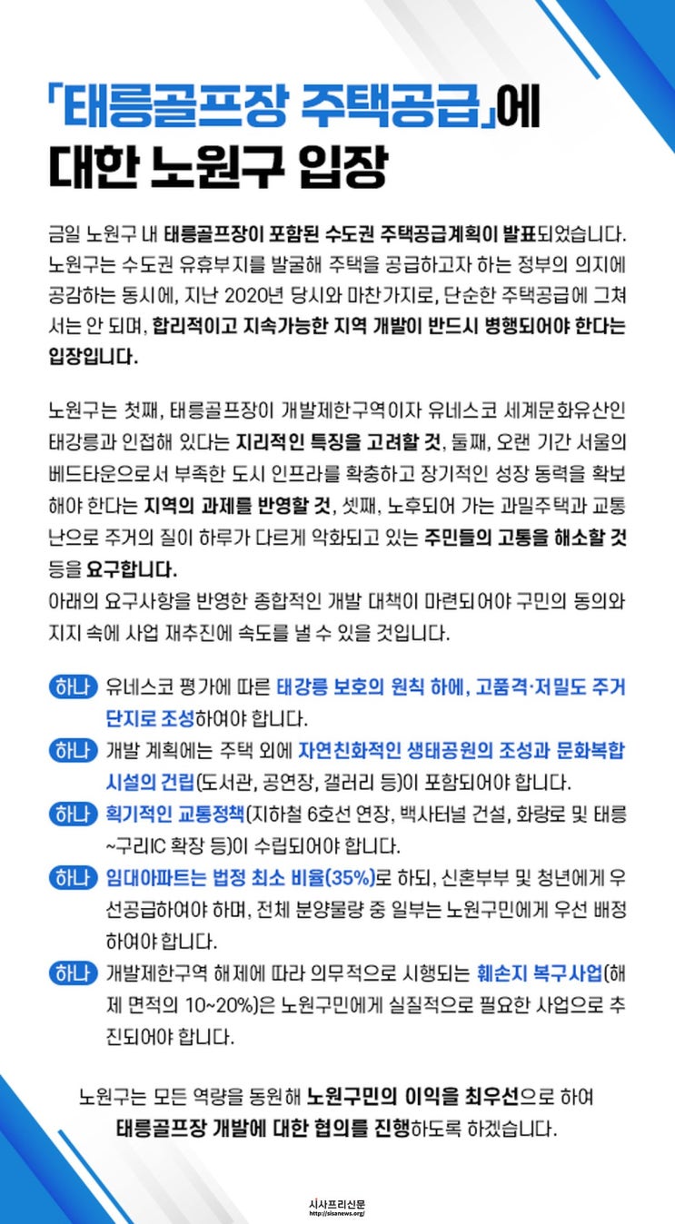 (시사프리신문=정진만 기자) 정부가 지난 1월 29일 오전 ‘도심 주택 공급 확대 및 신속화 방안’을 발표한 가운데, 노원구(구청장 오승록)가 같은 날 정부 발표 직후 공식 입장문을 통해 태릉골프장 주택공급 계획에 대한 구의 원칙과 요구사항을 밝혔다.