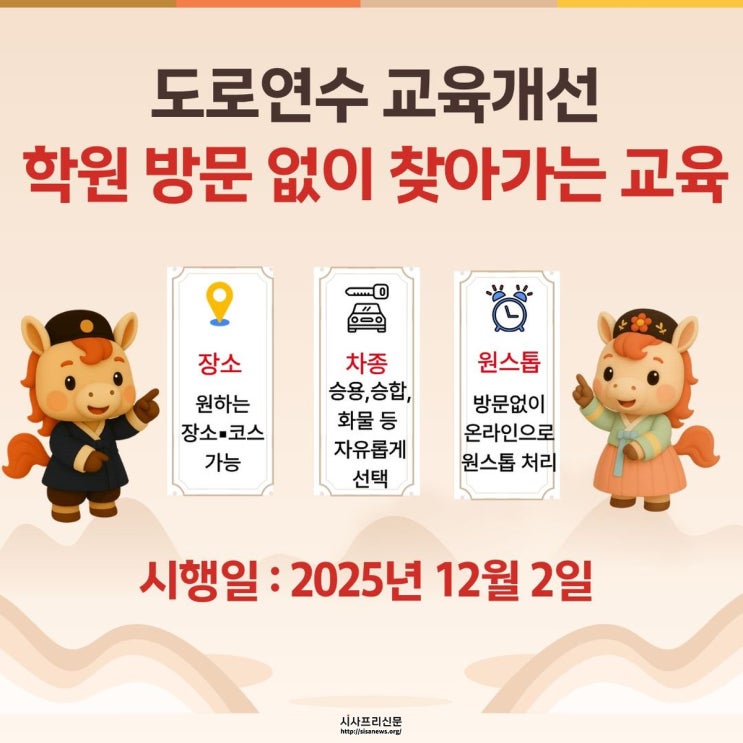 아울러 2025년 12월 2일부터는 도로 연수 교육이 학원 방문 없이 원하는 장소에서, 온라인 원스톱 방식으로 받을 수 있도록 개선된다.