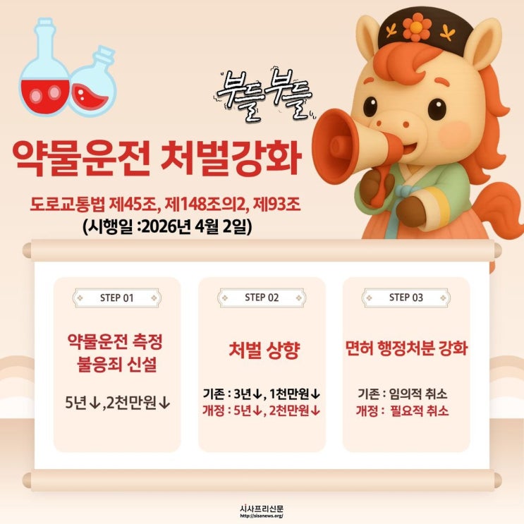 ▲ 약물 운전 처벌 신설·강화된다. 오는 2026년 4월 2일 시행되는 개정 도로교통법에 따라 약물 운전에 대한 처벌이 대폭 강화된다. 약물 운전 측정 거부 시에도 5년 이하 징역 또는 2천만 원 이하 벌금이 신설되며, 적발 시 면허 취소는 ‘임의’가 아닌 ‘필요적 취소’로 전환된다.