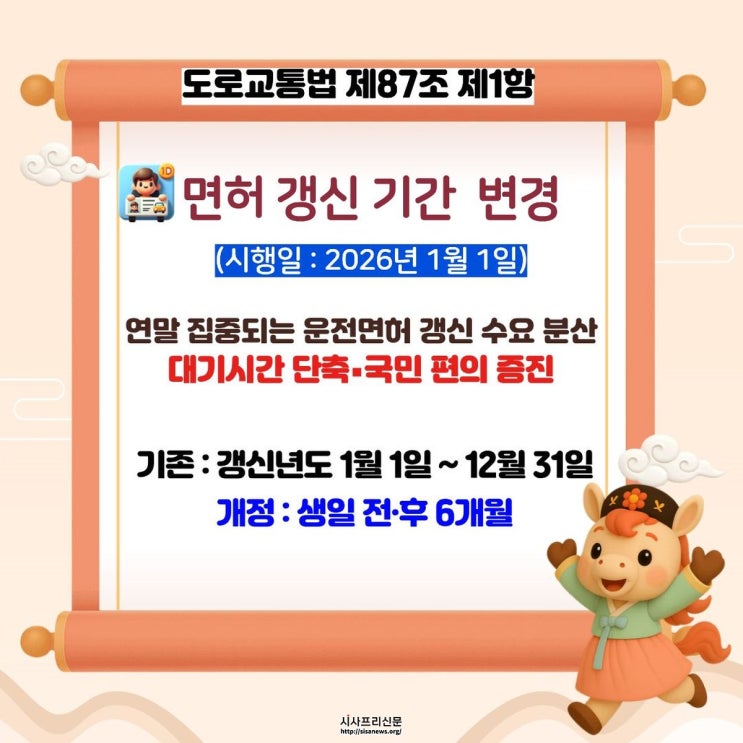 ▲ 운전면허 갱신·취득 절차 합리화. 운전면허 제도 역시 시민 편의를 중심으로 개편된다. 2026년 1월 1일부터 면허 갱신 기간이 ‘출생일 전후 6개월’로 확대돼 연말 대기 시간 혼잡이 해소될 전망이다.