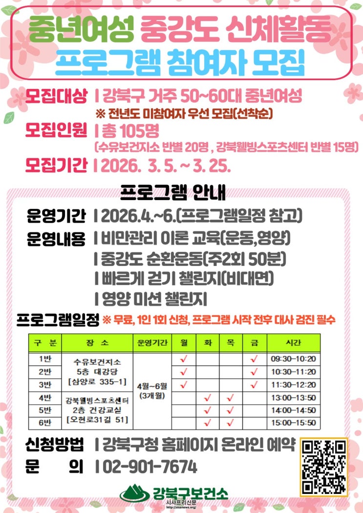 프로그램은 4월 1일부터 6월 30일까지 12주간 운영되며, 수유보건지소와 강북웰빙스포츠센터에서 6개 반으로 나뉘어 주 2회, 회당 50분씩 중강도 운동을 실시한다.