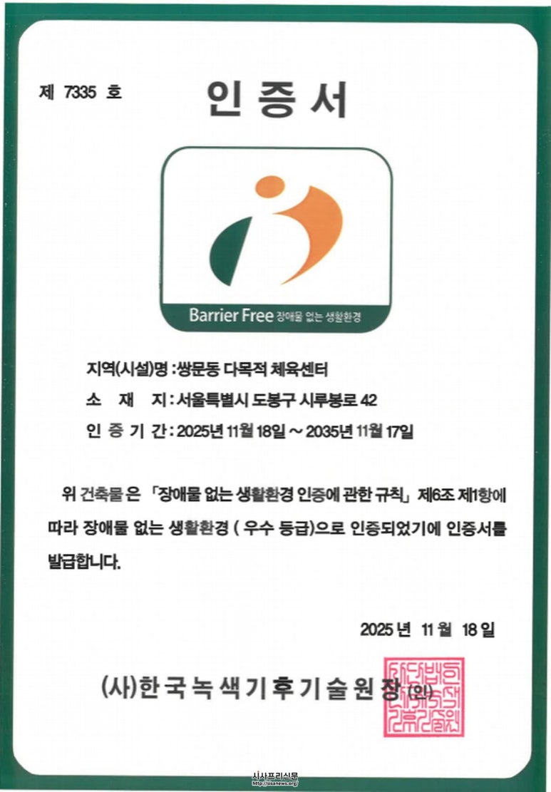 쌍문종합체육센터, 장애물 없는 생활환경(BF) 인증 획득 장애인·노약자·임산부 등 누구나 안전하고 편리한 이용 환경 구축 ▲ 쌍문종합체육센터가 획득한 ‘장애물 없는 생활환경(BF)’ 인증서 도봉구시설관리공단(이사장 김기수) 쌍문종합체육센터가 ‘장애물 없는 생활환경...