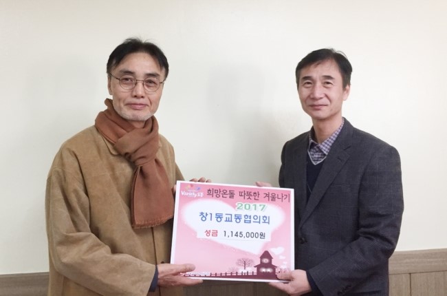 도봉구 창1동 교동협의회(회장 강성호)가 지난 10일 19곳의 교회를 대표해 ‘2017 희망온돌 따뜻한 겨울나기’ 성금 114만 5000원을 창1동 주민센터에 전달했다. 창1동 교동협의회는 민관 협력단체로 성능교회를 포함해 총 19곳의 교회가 참여하고 ...