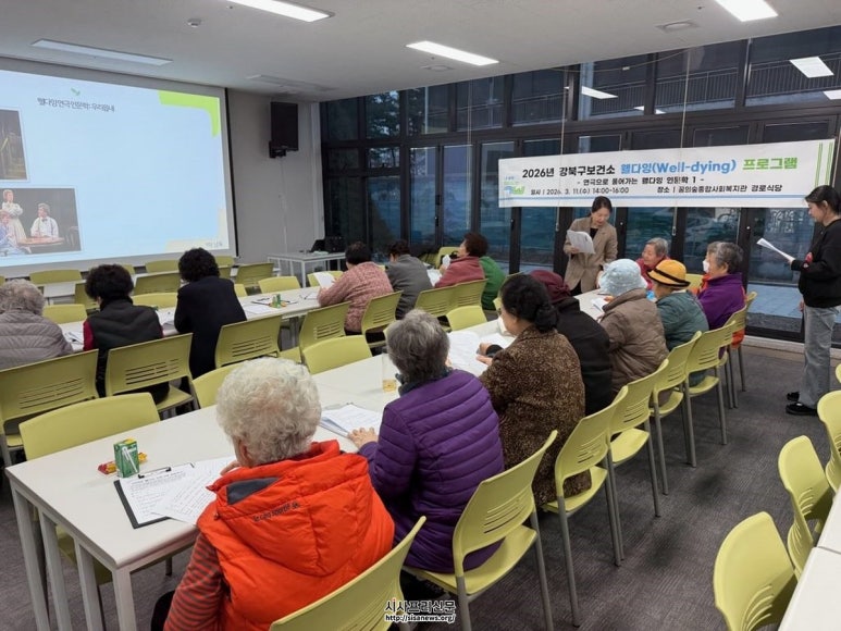 강북구, 스스로 가꾸는 존엄한 삶 위한 웰다잉 프로그램 운영 영화·인문학·버킷리스트 등 다양한 교육으로 삶의 의미 되새겨 꿈의숲종합사회복지관에서 웰다잉 프로그램이 진행됐다. 강북구(구청장 이순희)는 구민들이 삶의 의미를 되새기고 건강한 노후를 준비할 수 있도록 돕...